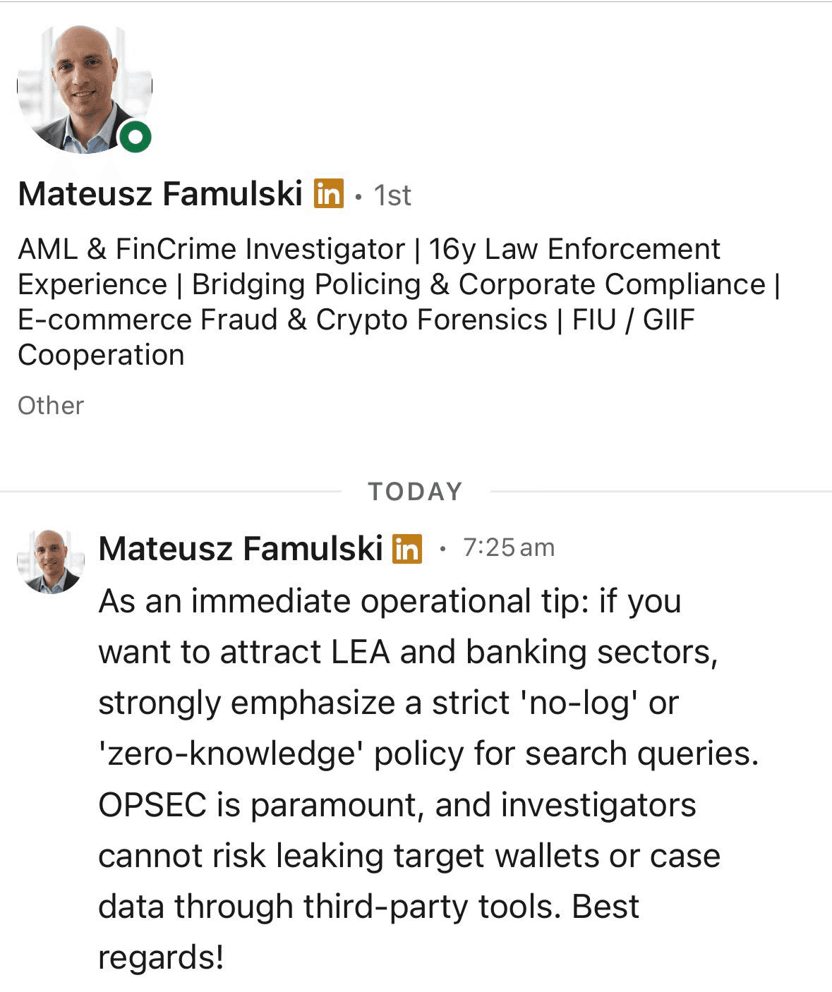 We've been in the space since the early days, building our edge through extensive attribution data, private sources, and in-house cross-chain linking tools. These come from on-chain heuristics, paid providers, two-way exchange partnerships, and law-enforcement annotations."