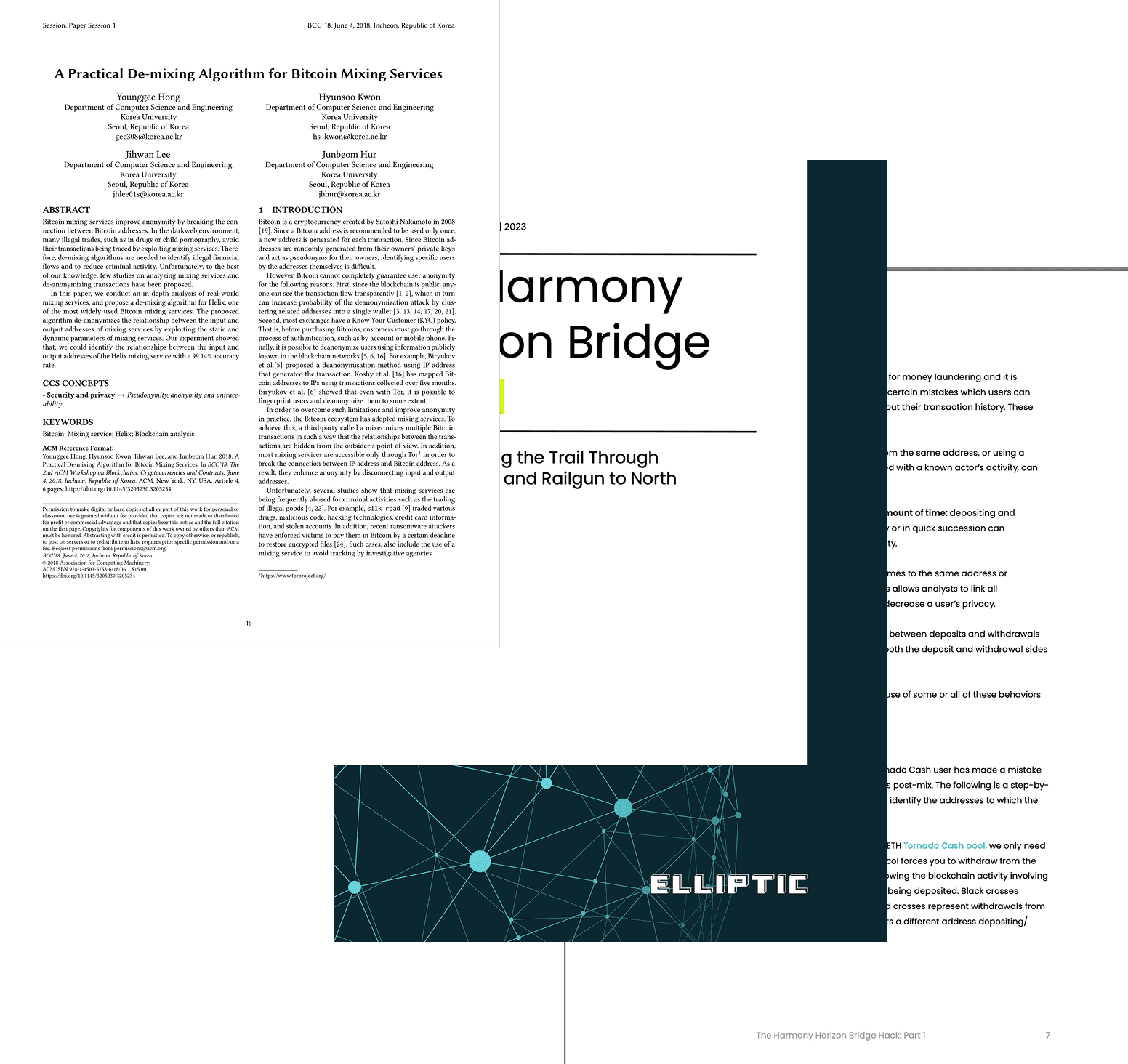 —— Y. Hong, H. Kwon, J. Lee, and J. Hur, "A practical de-mixing algorithm for Bitcoin mixing services," in Proc. ACM Asia Conf. Comput. Commun. Secur. (AsiaCCS), 2018