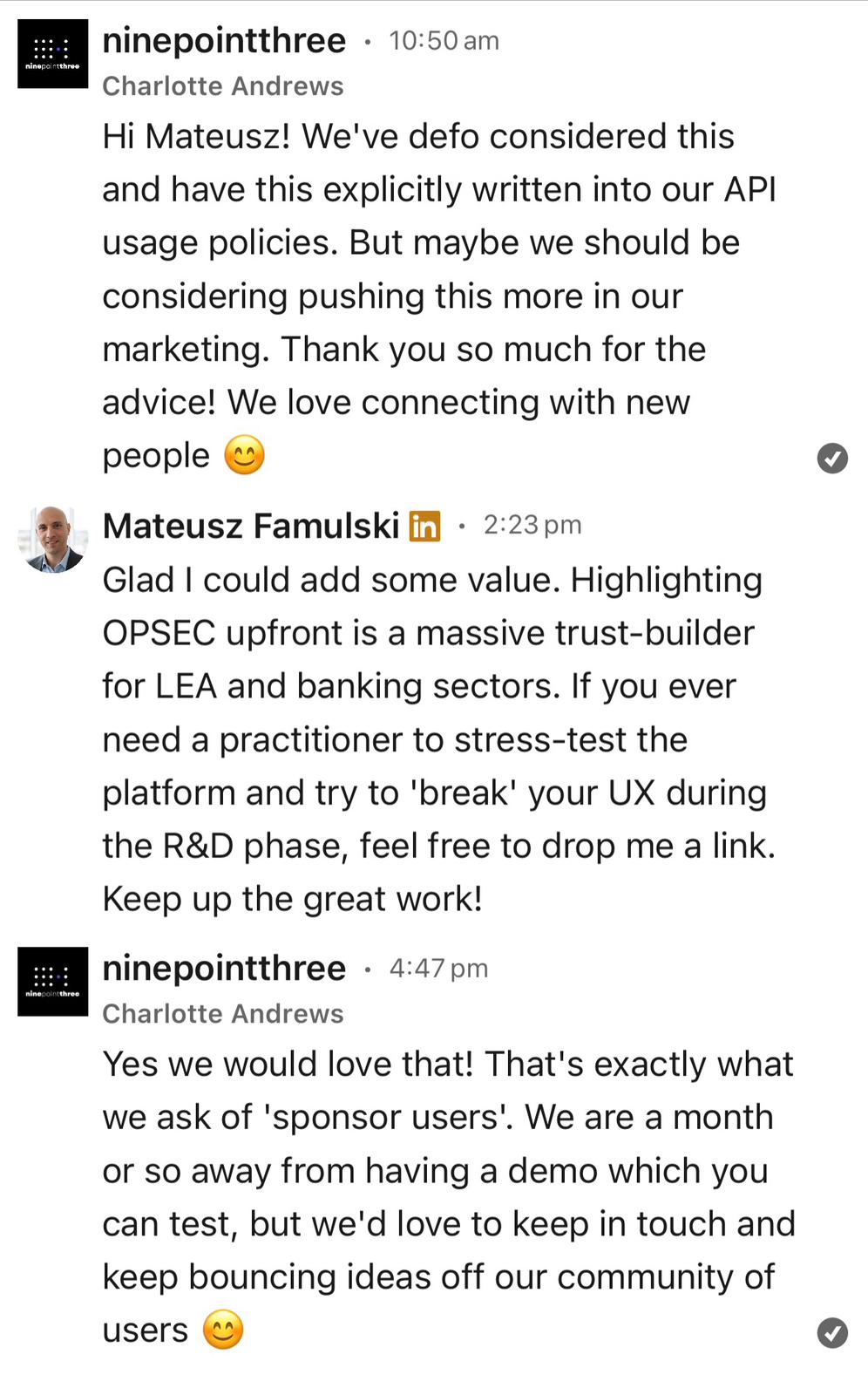 We conducted targeted outreach and in depth interviews with two industry influential voices to test if they would promote our tool in exchange for free access.
